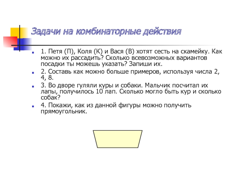 хотят сесть на скамейку. Как можно их рассадить? Сколько всевозможных вариантов посадки ты можешь указать? Запиши их.