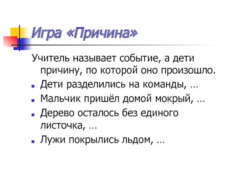 Учитель называет событие, а дети причину, по которой оно произошло.
