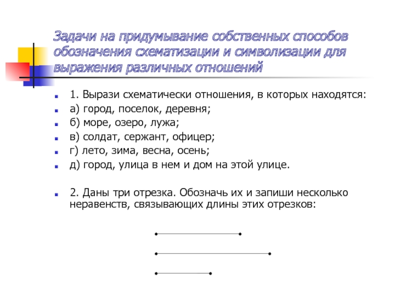 Слайд 7Задачи на придумывание собственных способов обозначения схематизации и символизации для выражения