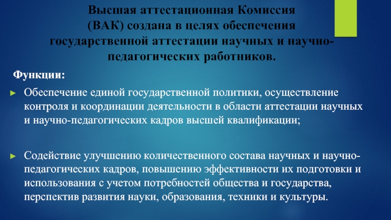 Обеспечение единой государственной политики, осуществление контроля и координации деятельности в области аттестации научных и научно-педагогических кадров высшей квалификации;