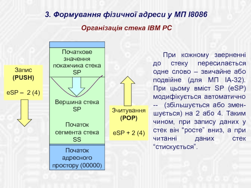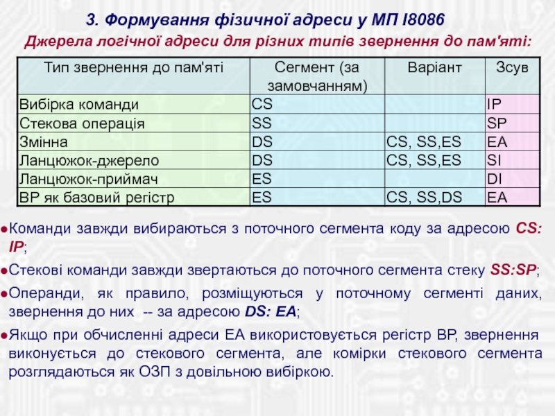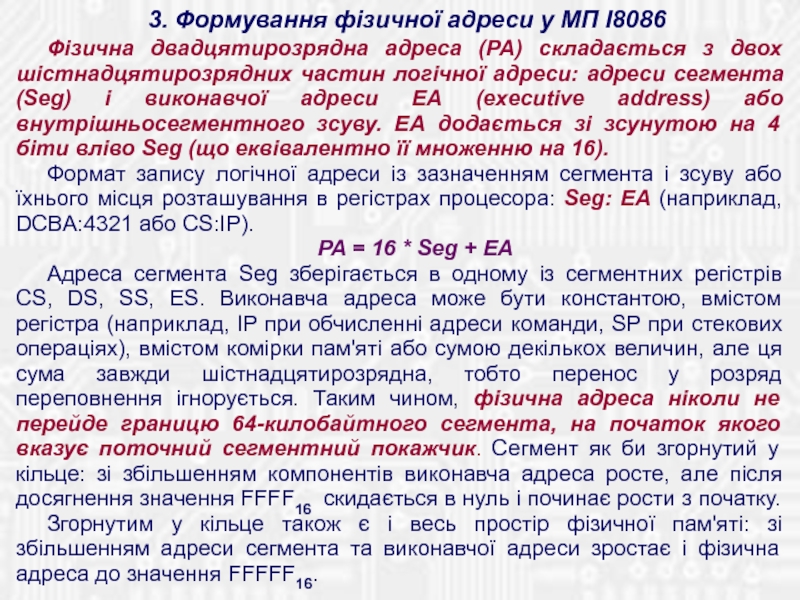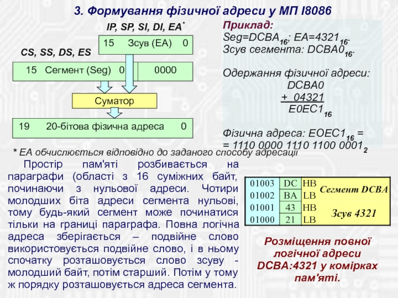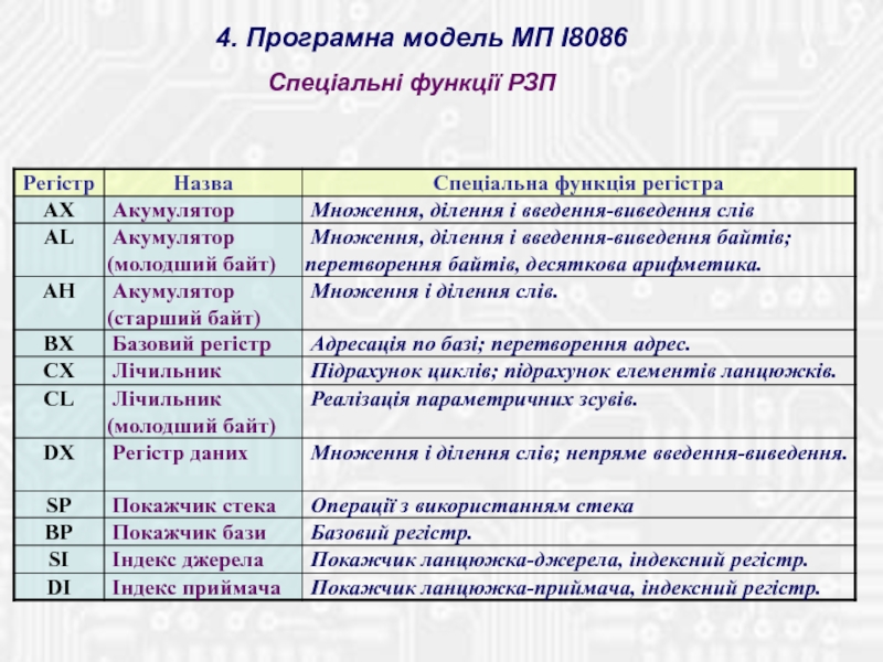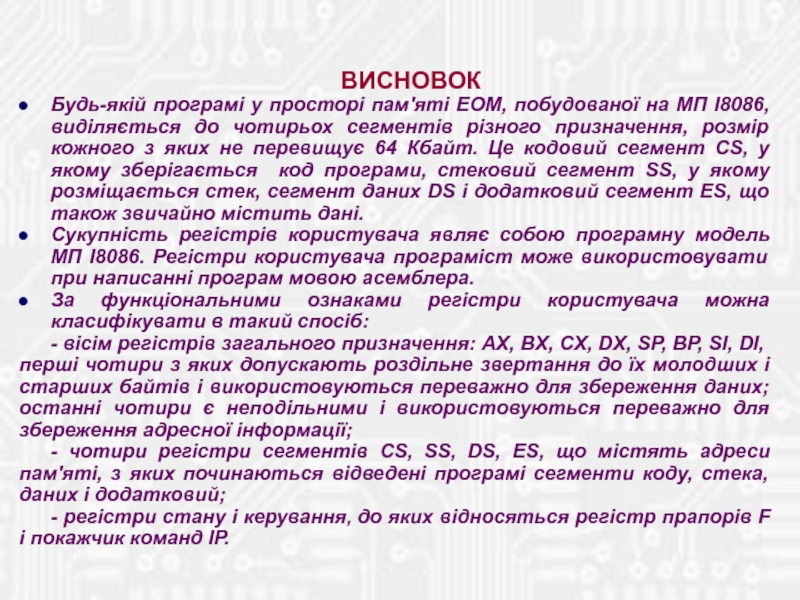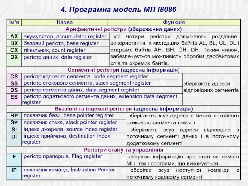Містить 14 16-бітових внутрішніх регістрів і 16-бітову ШД для зв'язку з пам'яттю і ПВВ. ША двадцятирозрядна, що дозволяє безпосе-редньо адресуватися до пам'яті обсягом 1 Мб. Використовується механізм сегментації пам'яті. Тобто, простір пам'яті розділений на сегменти по 64 Кбайт, причому в будь-який момент часу МП може звертатися до комірок чотирьох сегментів, що програмно обрані в якості поточних.
