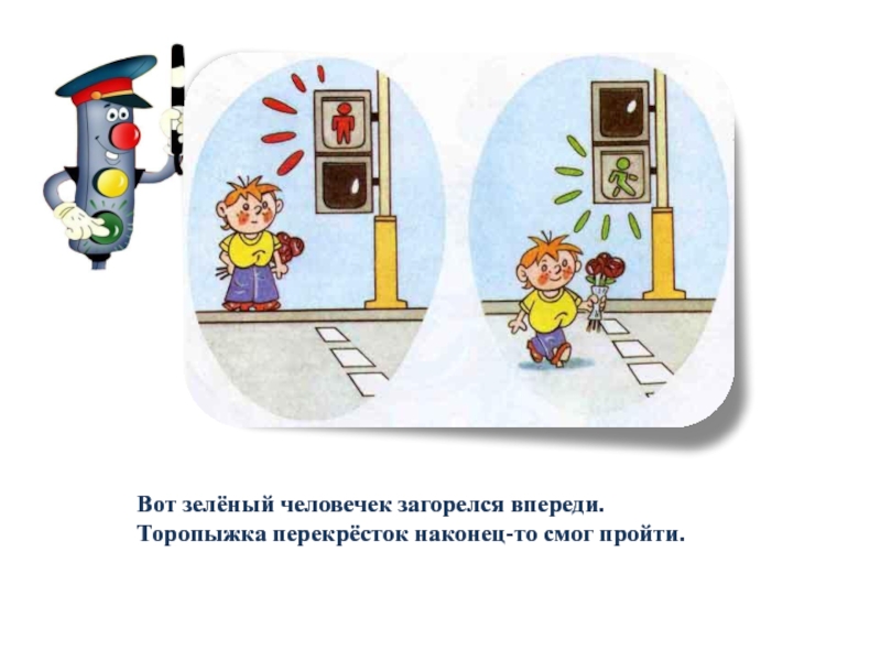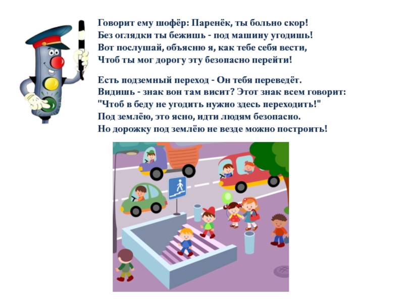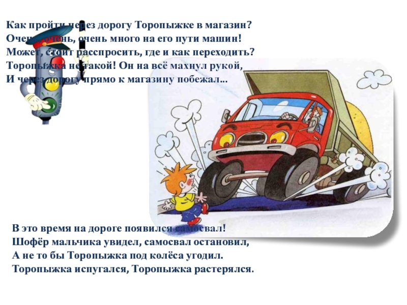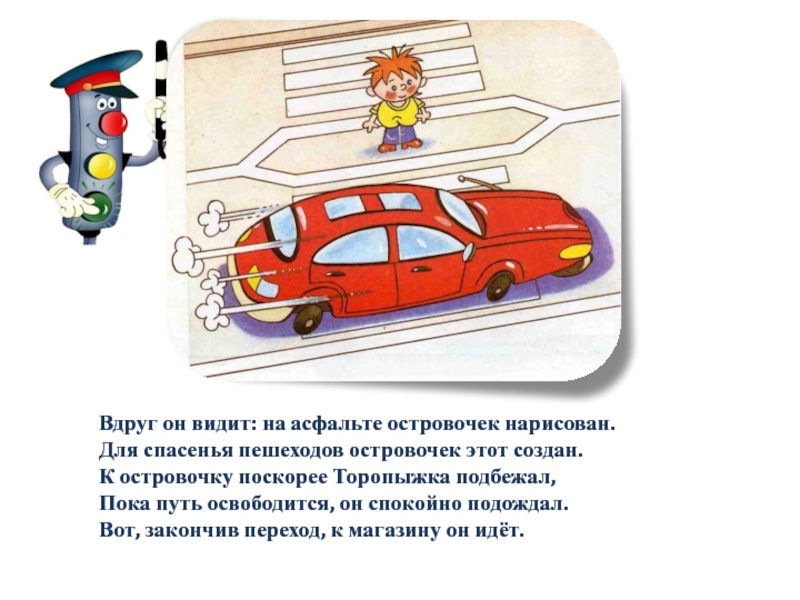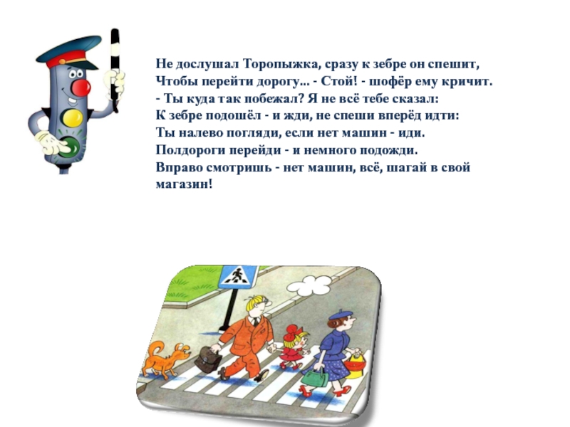 Слева нет машин - вперёд Торопыжка наш идёт.