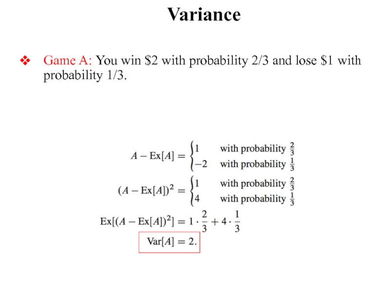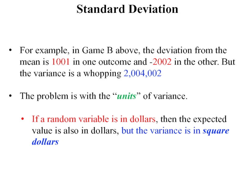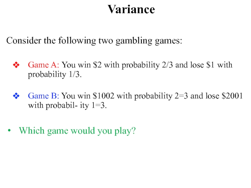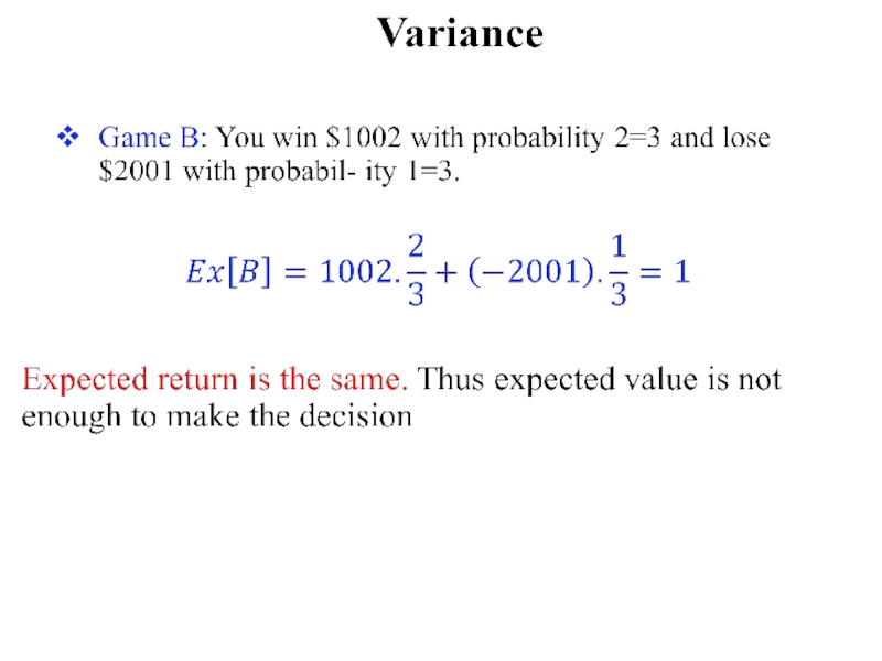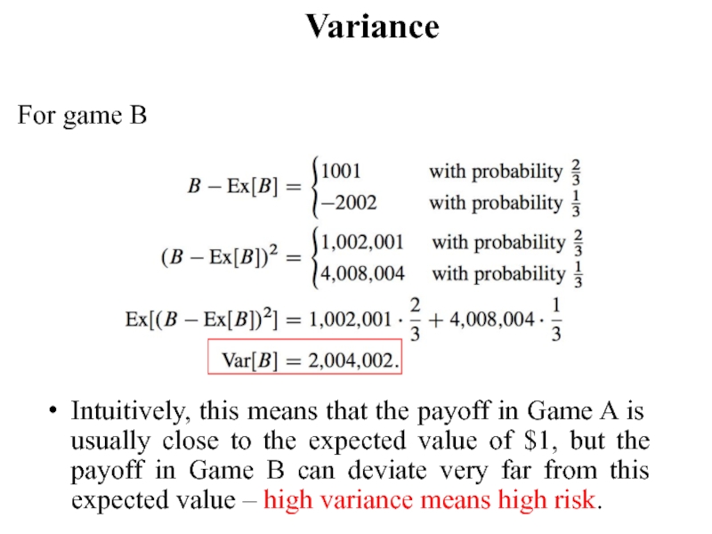 A is usually close to the expected value of $1, but the payoff in Game B can deviate very far from this expected value – high variance means high risk.