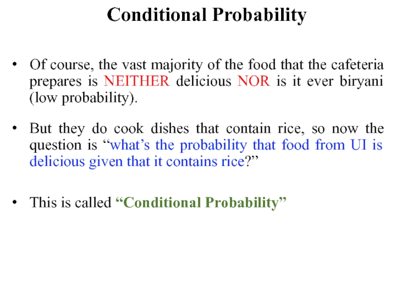 But they do cook dishes that contain rice, so now the question is “what’s the probability that food from UI is delicious given that it contains rice?”