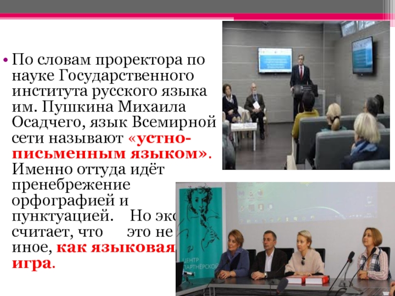 Михаила Осадчего, язык Всемирной сети называют «устно-письменным языком». Именно оттуда идёт пренебрежение орфографией и пунктуацией. Но эксперт считает, что это не что иное, как языковая игра.