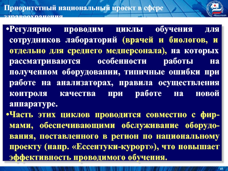 лабораторий (врачей и биологов, и отдельно для среднего медперсонала), на которых рассматриваются особенности работы на полученном оборудовании, типичные ошибки при работе на анализаторах, правила осуществления контроля качества при работе на новой аппаратуре.