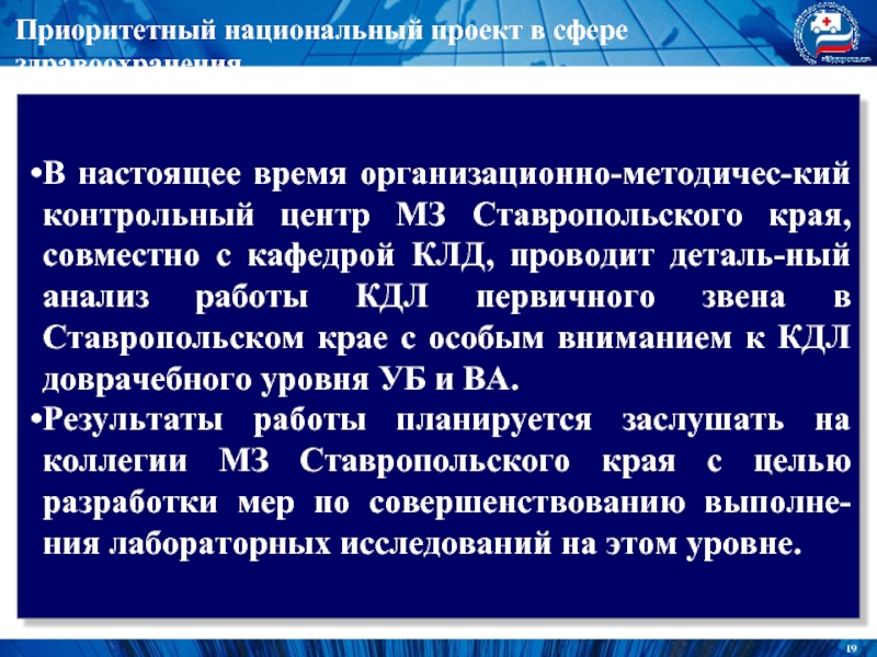 МЗ Ставропольского края, совместно с кафедрой КЛД, проводит деталь-ный анализ работы КДЛ первичного звена в Ставропольском крае с особым вниманием к КДЛ доврачебного уровня УБ и ВА.