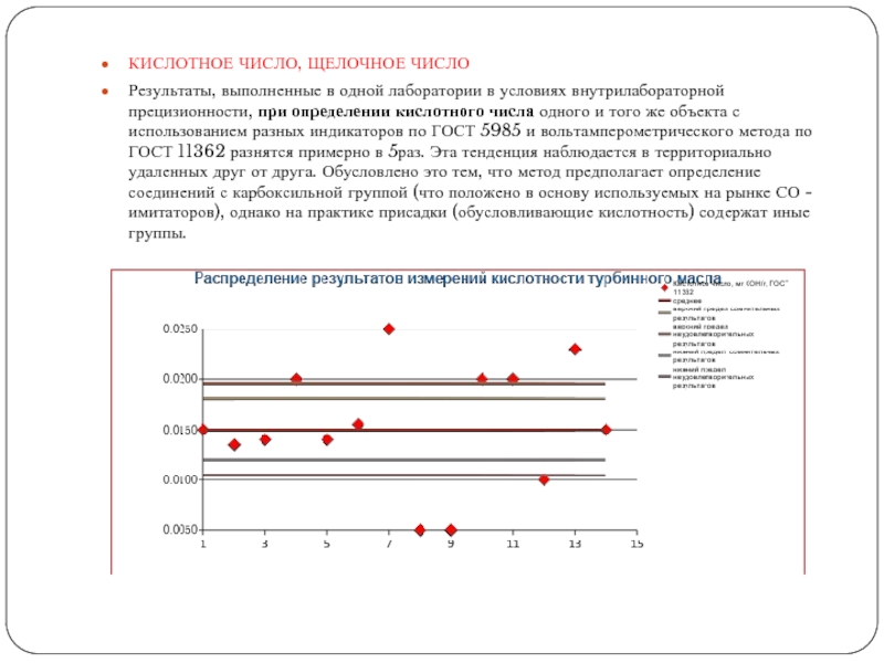 прецизионности, при определении кислотного числа одного и того же объекта с использованием разных индикаторов по ГОСТ 5985 и вольтамперометрического метода по ГОСТ 11362 разнятся примерно в 5раз. Эта тенденция наблюдается в территориально удаленных друг от друга. Обусловлено это тем, что метод предполагает определение соединений с карбоксильной группой (что положено в основу используемых на рынке СО - имитаторов), однако на практике присадки (обусловливающие кислотность) содержат иные группы.