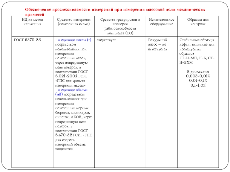 Слайд 25Обеспечение прослеживаемости измерений при измерении массовой доли механических примесей