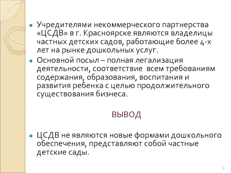 Слайд 9Учредителями некоммерческого партнерства «ЦСДВ» в г. Красноярске являются владелицы частных детских