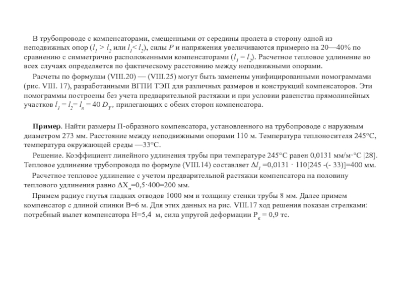 Решение. Коэффициент линейного удлинения трубы при температуре 245°С равен 0,0131 мм/м·°С |28]. Тепловое удлинение трубопровода по формуле (VIII.14) составляет Δl1 =0,0131 · 110[245 -(- 33)]=400 мм.