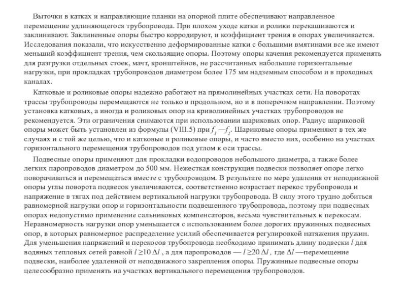 перемещение удлиняющегося трубопровода. При плохом уходе катки и ролики перекашиваются и заклинивают. Заклиненные опоры быстро корродируют, и коэффициент трения в опорах увеличивается. Исследования показали, что искусственно деформированные катки с большими вмятинами все же имеют меньший коэффициент трения, чем скользящие опоры. Поэтому опоры качения рекомендуется применять для разгрузки отдельных стоек, мачт, кронштейнов, не рассчитанных набольшие горизонтальные нагрузки, при прокладках трубопроводов диаметром более 175 мм надземным способом и в проходных каналах.