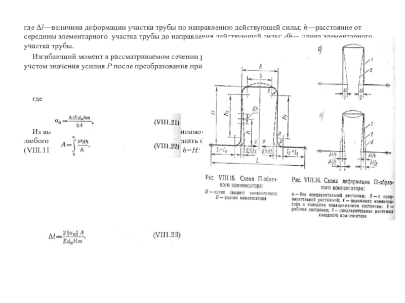 Подставляя в (VIII.23) значение интеграла A, найденное по формуле (VIII.22) для конкретной схемы гибкого компенсатора, можно получить расчетное уравнение компенсирующей способности для различных симметричных компенсаторов. С помощью уравнений (VIII.20), (VIII.23) и (VIII.24) могут быть найдены усилия, вызывающие деформацию, и фактические напряжения в компенсаторе принятых размеров.