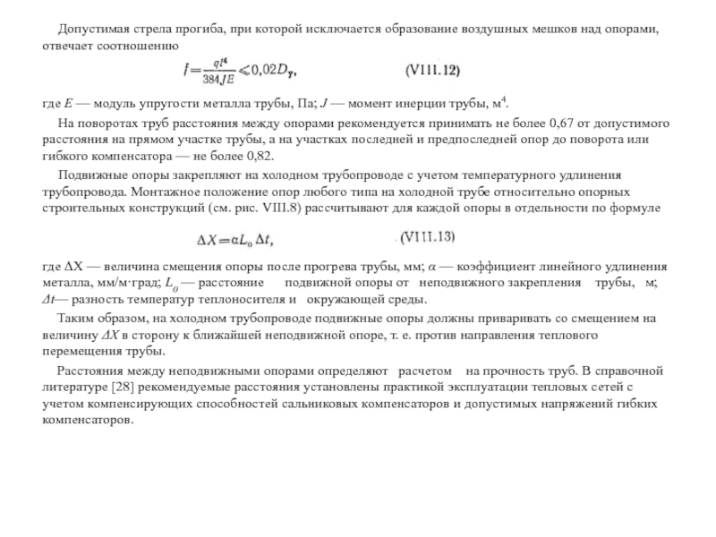 Допустимое расстояние между опорами определяется из условий прочности и допустимой стрелы прогиба трубы на середине пролета для наиболее неблагоприятных режимов работы теплопровода, при которых в самом ослабленном сечении (обычно сварные стыка) напряжения не должны превышать допустимых. Заменяя в выражении (VIII.7) значение изгибающего момента равенством Мо=[σи]W, найдем допустимое расстояние между опорами