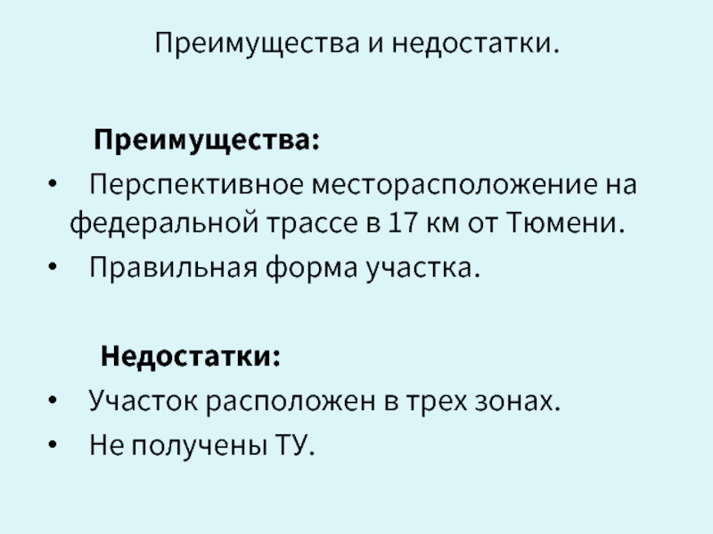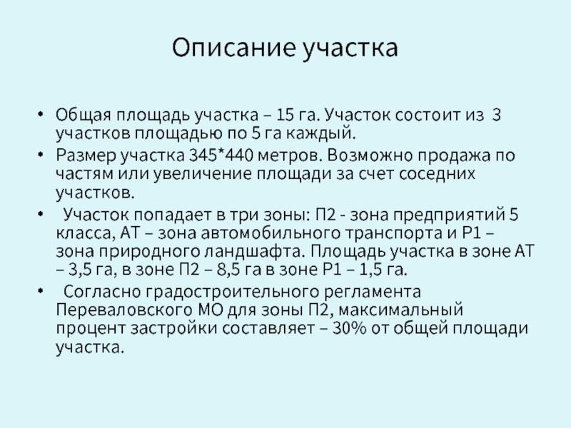 Участок попадает в три зоны: П2 - зона предприятий 5 класса, АТ – зона автомобильного транспорта и Р1 – зона природного ландшафта. Площадь участка в зоне АТ – 3,5 га, в зоне П2 – 8,5 га в зоне Р1 – 1,5 га.