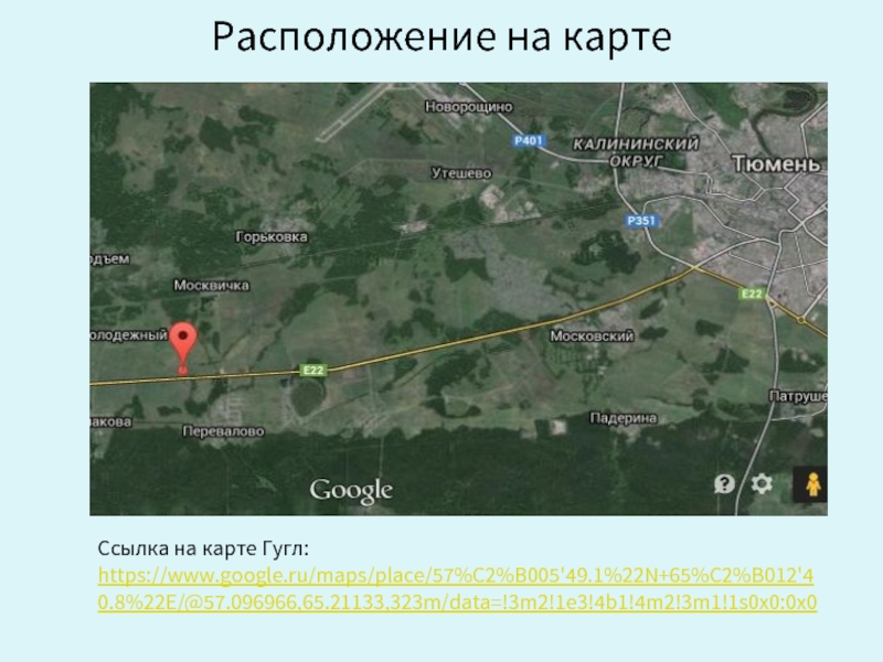 Ссылка на карте Гугл: https://www.google.ru/maps/place/57%C2%B005'49.1%22N+65%C2%B012'40.8%22E/@57.096966,65.21133,323m/data=!3m2!1e3!4b1!4m2!3m1!1s0x0:0x0