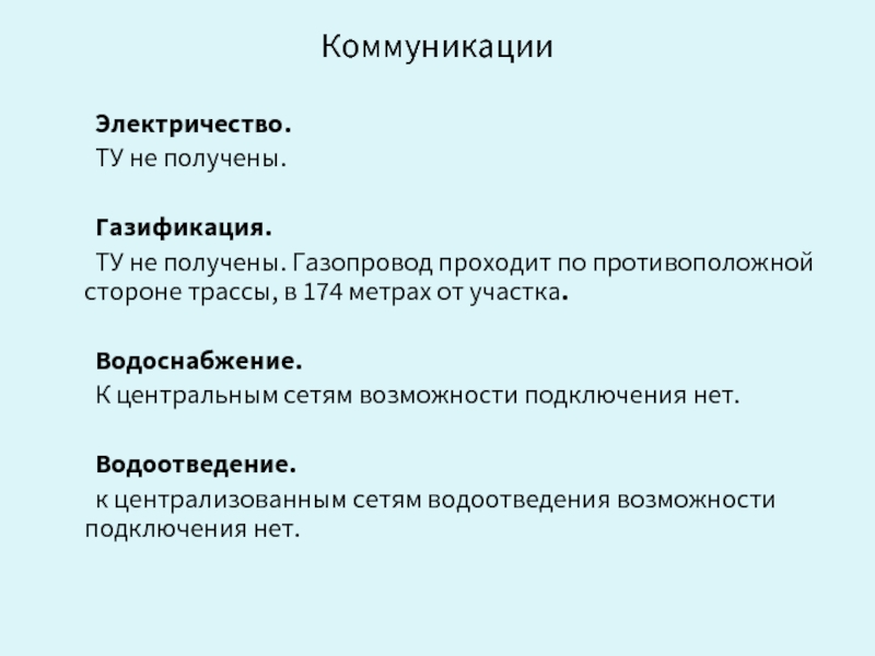 ТУ не получены. Газопровод проходит по противоположной стороне трассы, в 174 метрах от участка.