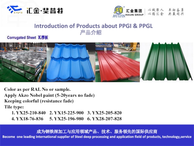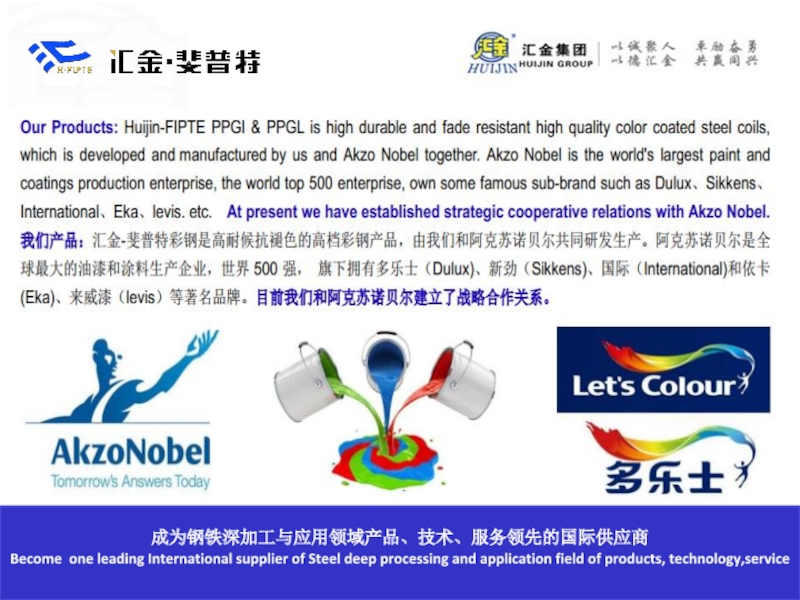 I am Fiona Wang from Huijin Color Steel Company which was founded in 1988, we establish a strategic cooperative relations with Akzo Nobel to research and develop, produce and sell PPGI & PPGL Steel Coils together.