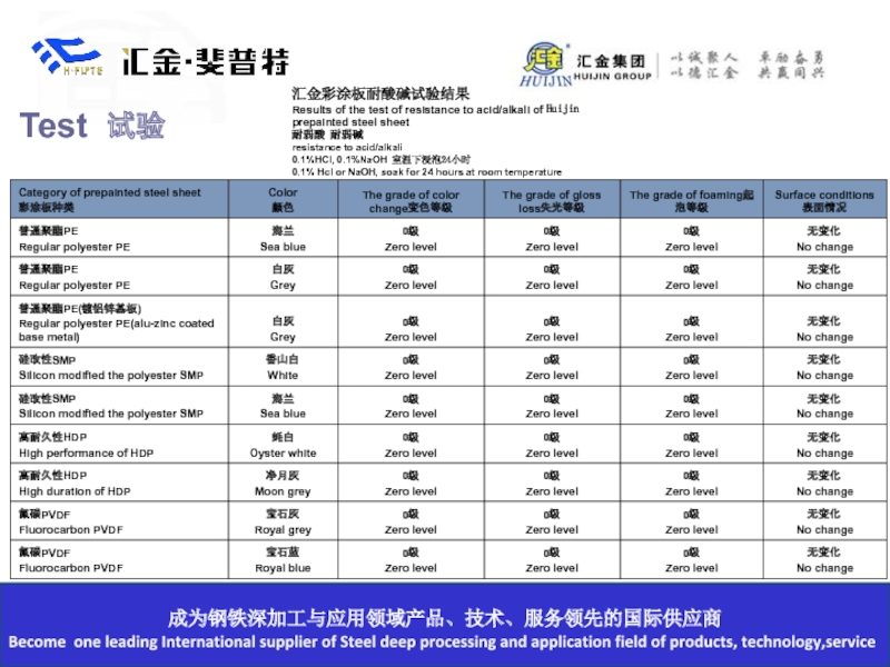 Results of the test of resistance to acid/alkali of Huijin prepainted steel sheet