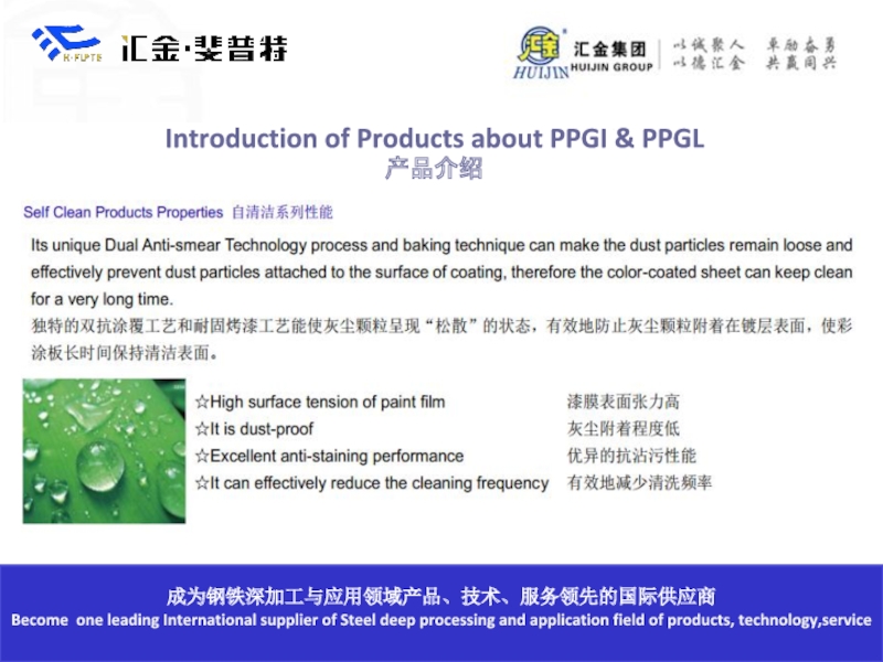 The kinds of PPGI & PPGL including: PE, HDP, SMP, PVDF, Matte & Grain & Texture & Wrinkly Effect, " Cool Roof", "Antibiosis", "Self-Cleaning" and " Antistatic" Series.