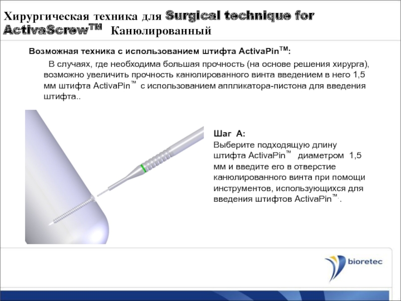 Выберите подходящую длину штифта ActivaPin™ диаметром 1,5 мм и введите его в отверстие канюлированного винта при помощи инструментов, использующихся для введения штифтов ActivaPin™..