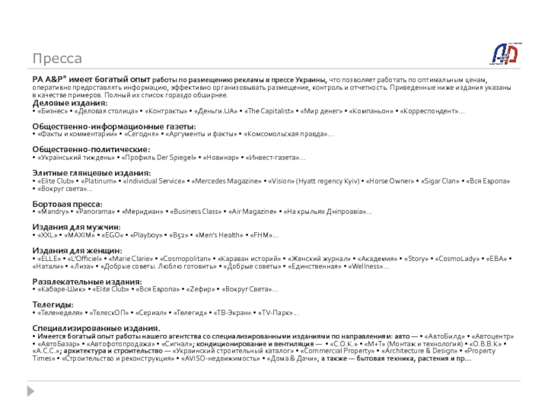 РА A&P® имеет богатый опыт работы по размещению рекламы в прессе