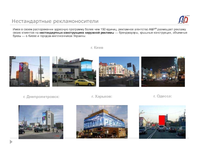 рекламное агентство A&P® размещает рекламу своих клиентов на нестандартных конструкциях наружной рекламы — брендмауэры, крышные конструкции, объемные буквы — в Киеве и городах-миллионниках Украины.