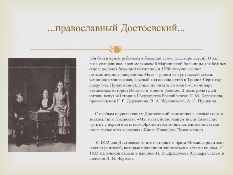 С особым одушевлением Достоевский вспоминал в зрелые годы о знакомстве с Писанием: «Мы в семействе нашем знали Евангелие чуть не с первого детства». Ярким детским впечатлением писателя стала также ветхозаветная «Книга Иова»(см. Приложение)
