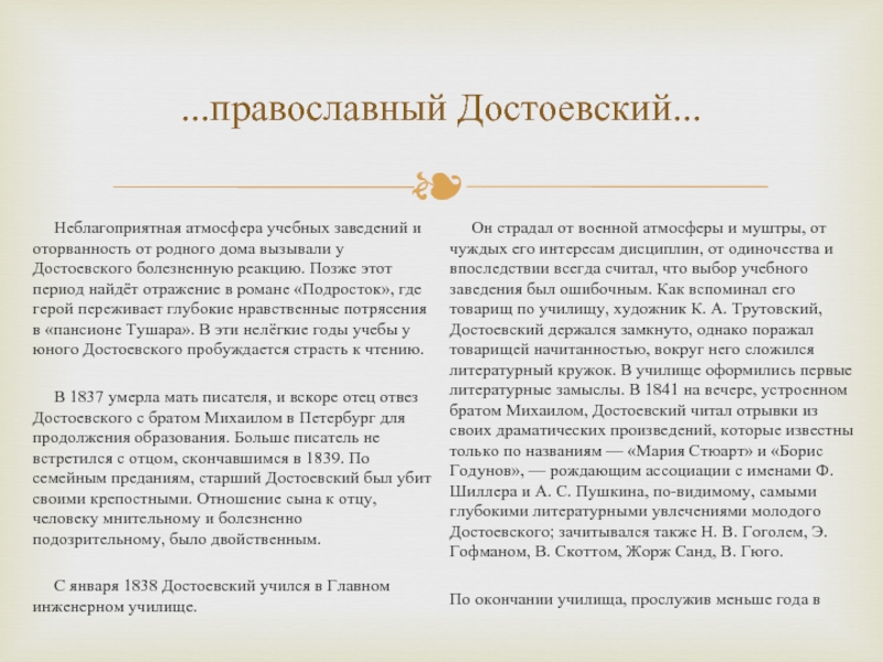 родного дома вызывали у Достоевского болезненную реакцию. Позже этот период найдёт отражение в романе «Подросток», где герой переживает глубокие нравственные потрясения в «пансионе Тушара». В эти нелёгкие годы учебы у юного Достоевского пробуждается страсть к чтению.
