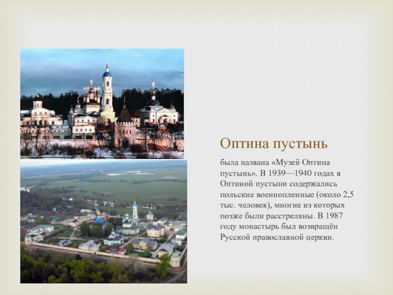 пустыни содержались польские военнопленные (около 2,5 тыс. человек), многие из которых позже были расстреляны. В 1987 году монастырь был возвращён Русской православной церкви.