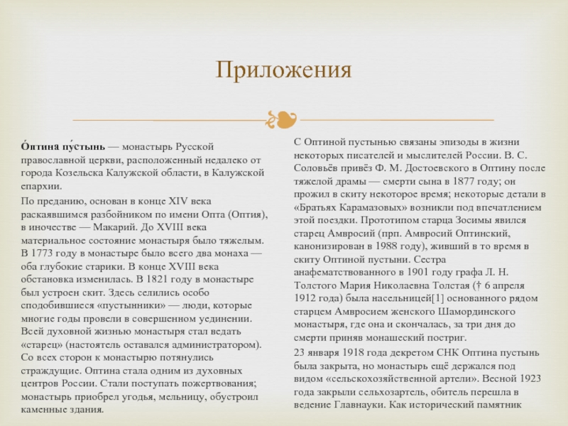 С Оптиной пустынью связаны эпизоды в жизни некоторых писателей и мыслителей России. В. С. Соловьёв привёз Ф. М. Достоевского в Оптину после тяжелой драмы — смерти сына в 1877 году; он прожил в скиту некоторое время; некоторые детали в «Братьях Карамазовых» возникли под впечатлением этой поездки. Прототипом старца Зосимы явился старец Амвросий (прп. Амвросий Оптинский, канонизирован в 1988 году), живший в то время в скиту Оптиной пустыни. Сестра анафематствованного в 1901 году графа Л. Н. Толстого Мария Николаевна Толстая († 6 апреля 1912 года) была насельницей[1] основанного рядом старцем Амвросием женского Шамординского монастыря, где она и скончалась, за три дня до смерти приняв монашеский постриг.