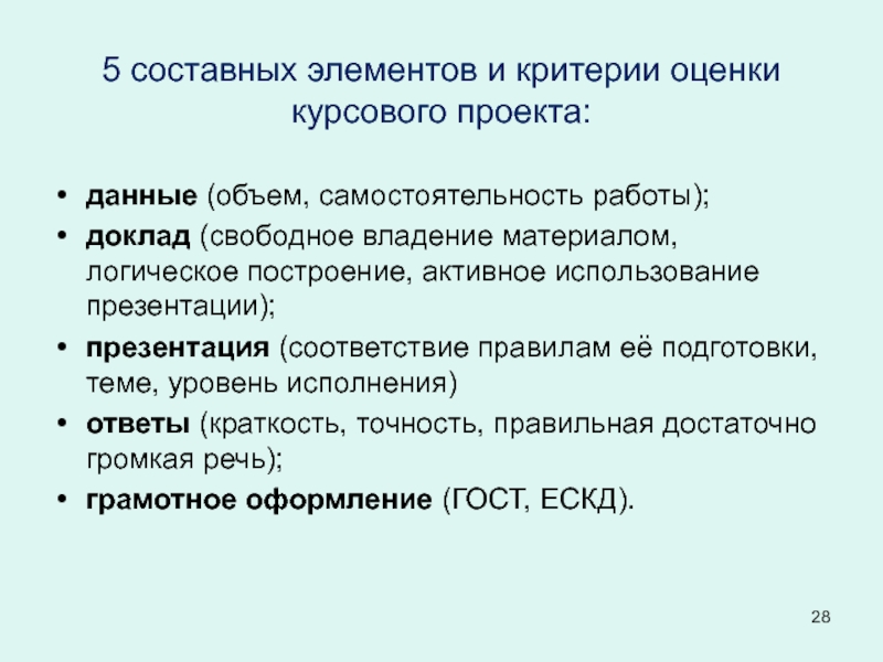 Слайд 285 составных элементов и критерии оценки курсового проекта: