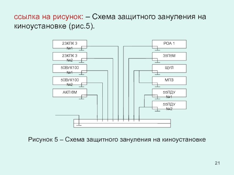 Слайд 21ссылка на рисунок: – Схема защитного зануления на киноустановке (рис.5).