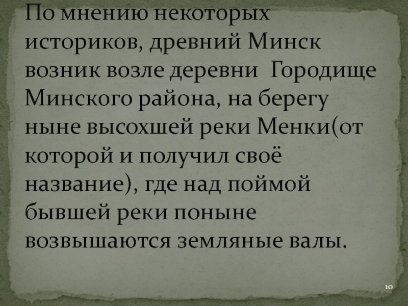Слайд 10По мнению некоторых историков, древний Минск возник возле деревни Городище Минского