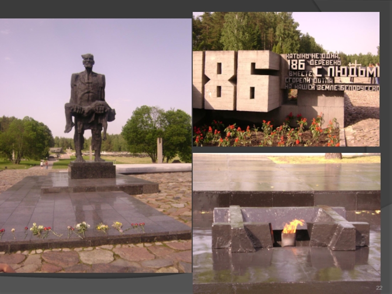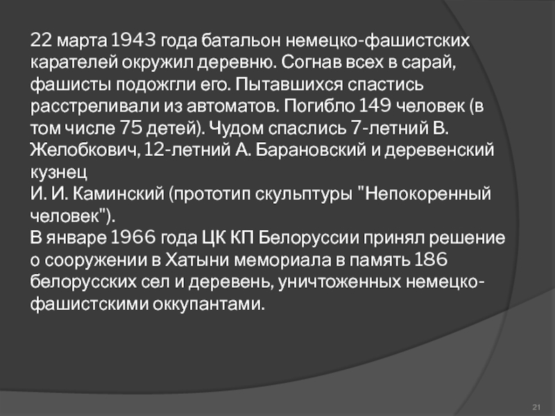 Слайд 2122 марта 1943 года батальон немецко-фашистских карателей окружил деревню. Согнав всех