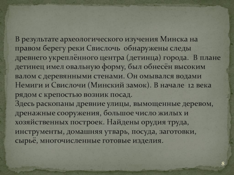 Слайд 8В результате археологического изучения Минска на правом берегу реки Свислочь обнаружены