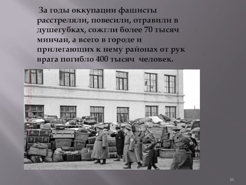 Слайд 16 За годы оккупации фашисты расстреляли, повесили, отравили в душегубках, сожгли