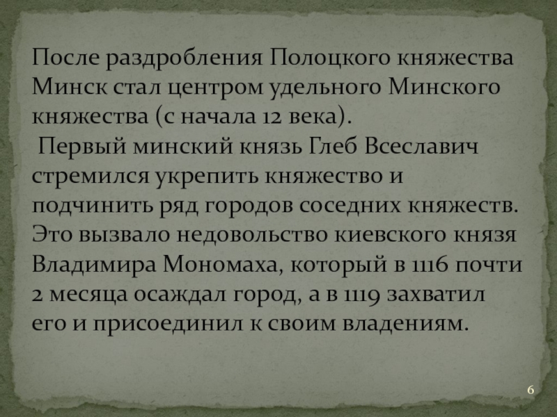 Слайд 6После раздробления Полоцкого княжества Минск стал центром удельного Минского княжества (с