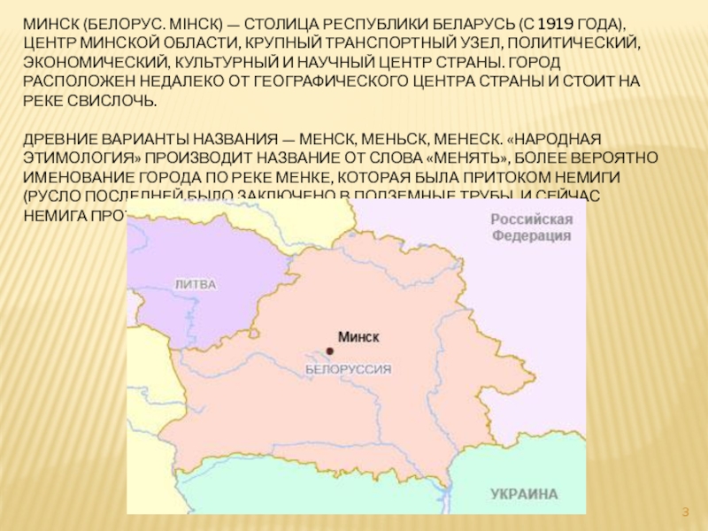 Слайд 3МИНСК (БЕЛОРУС. МІНСК) — СТОЛИЦА РЕСПУБЛИКИ БЕЛАРУСЬ (С 1919 ГОДА), ЦЕНТР