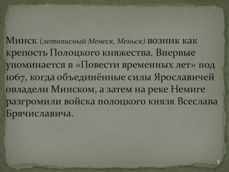 Слайд 5Минск (летописный Менеск, Меньск) возник как крепость Полоцкого княжества. Впервые упоминается