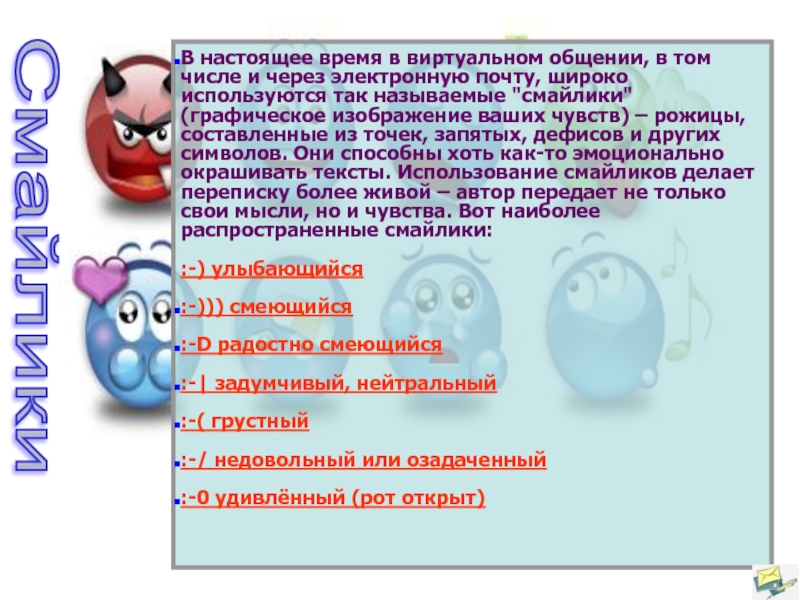 через электронную почту, широко используются так называемые "смайлики" (графическое изображение ваших чувств) – рожицы, составленные из точек, запятых, дефисов и других символов. Они способны хоть как-то эмоционально окрашивать тексты. Использование смайликов делает переписку более живой – автор передает не только свои мысли, но и чувства. Вот наиболее распространенные смайлики:
