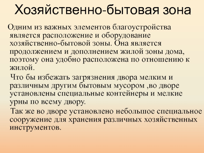 оборудование хозяйственно-бытовой зоны. Она является продолжением и дополнением жилой зоны дома, поэтому она удобно расположена по отношению к жилой.