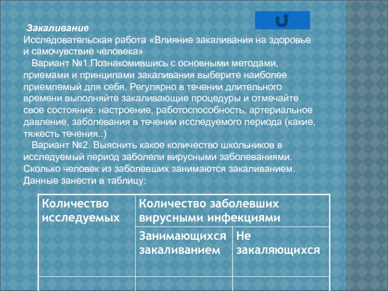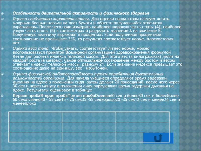 Оценка физической работоспособности путем определения дыхательных возможностей организма. Для начала учащиеся определяют время задержки дыхания на вдохе в положении сидя, затем делают 20 приседаний, после чего через 30 сек и через минуту в положении сидя определяют время задержки дыхания на вдохе. Результаты оценивают в таблице:
