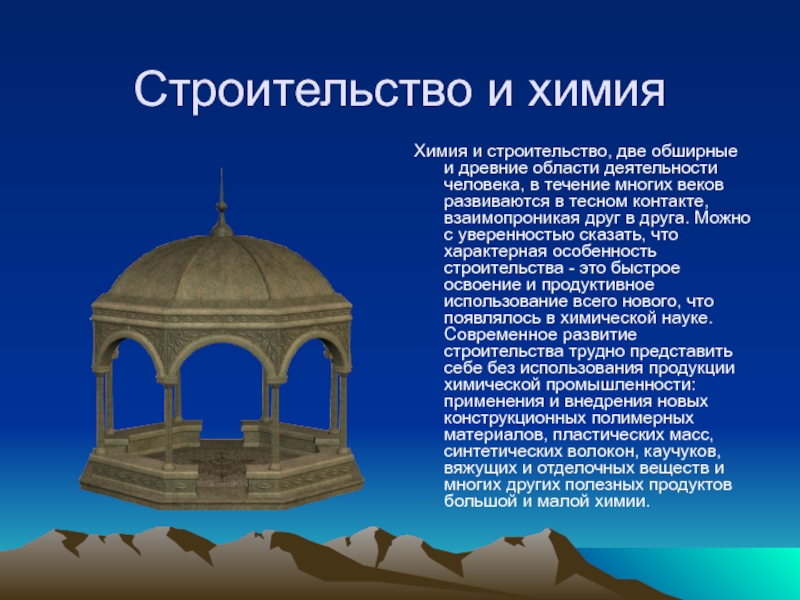 человека, в течение многих веков развиваются в тесном контакте, взаимопроникая друг в друга. Можно с уверенностью сказать, что характерная особенность строительства - это быстрое освоение и продуктивное использование всего нового, что появлялось в химической науке. Современное развитие строительства трудно представить себе без использования продукции химической промышленности: применения и внедрения новых конструкционных полимерных материалов, пластических масс, синтетических волокон, каучуков, вяжущих и отделочных веществ и многих других полезных продуктов большой и малой химии.