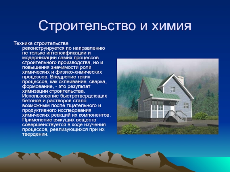 и модернизации самих процессов строительного производства, но и повышения значимости роли химических и физико-химических процессов. Внедрение таких процессов, как склеивание, сварка, формование, - это результат химизации строительства. Использование быстротвердеющих бетонов и растворов стало возможным после тщательного и продуктивного исследования химических реакций их компонентов. Применение вяжущих веществ совершенствуется в ходе изучения процессов, реализующихся при их твердении.