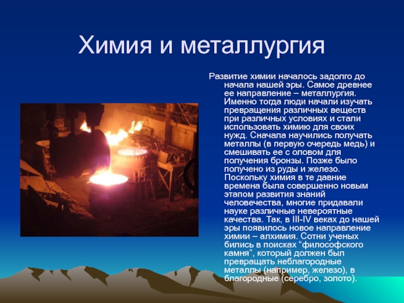 древнее ее направление – металлургия. Именно тогда люди начали изучать превращения различных веществ при различных условиях и стали использовать химию для своих нужд. Сначала научились получать металлы (в первую очередь медь) и смешивать ее с оловом для получения бронзы. Позже было получено из руды и железо.
