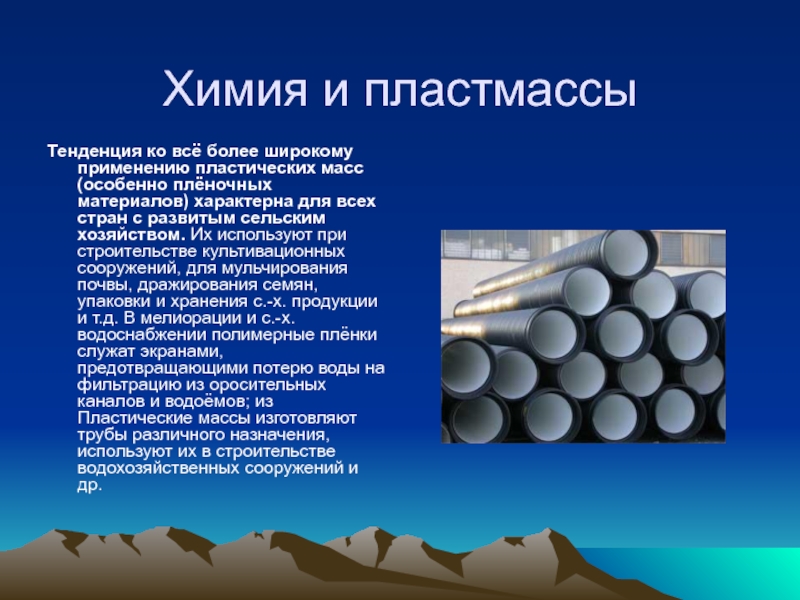 плёночных материалов) характерна для всех стран с развитым сельским хозяйством. Их используют при строительстве культивационных сооружений, для мульчирования почвы, дражирования семян, упаковки и хранения с.-х. продукции и т.д. В мелиорации и с.-х. водоснабжении полимерные плёнки служат экранами, предотвращающими потерю воды на фильтрацию из оросительных каналов и водоёмов; из Пластические массы изготовляют трубы различного назначения, используют их в строительстве водохозяйственных сооружений и др.