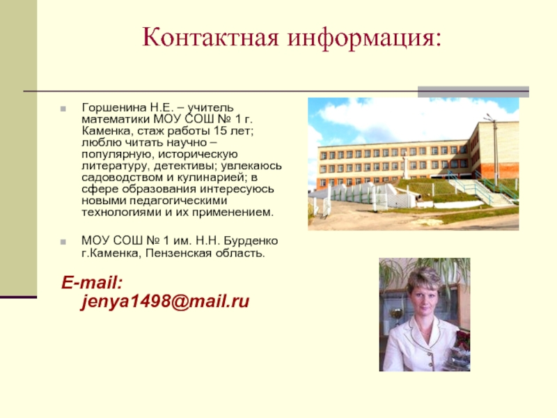 Автор: учитель математики Горшенина Н.Е., МОУ СОШ №1 им.Н.Н.Бурденко