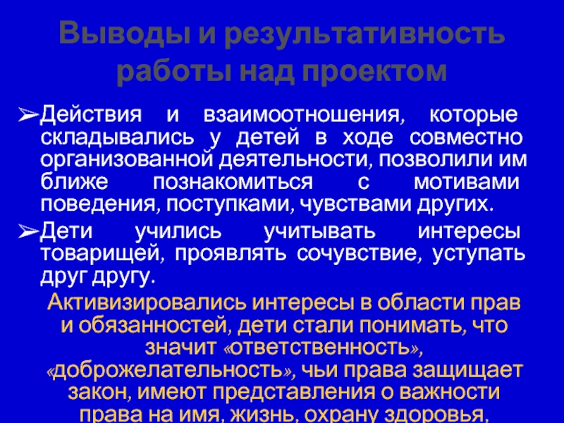 Активизировались интересы в области прав и обязанностей, дети стали понимать, что значит «ответственность», «доброжелательность», чьи права защищает закон, имеют представления о важности права на имя, жизнь, охрану здоровья, образование., свободу.