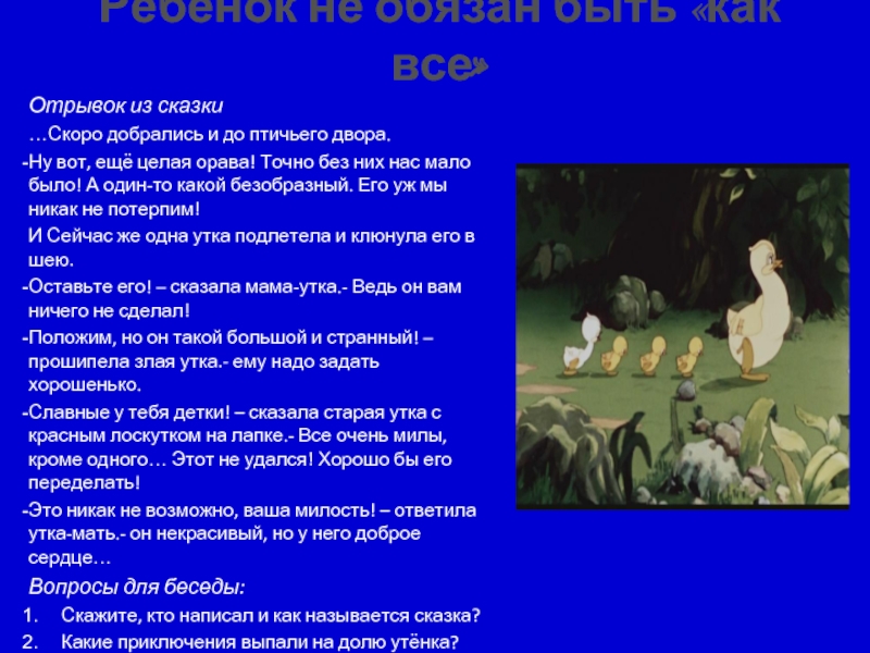 Славные у тебя детки! – сказала старая утка с красным лоскутком на лапке.- Все очень милы, кроме одного… Этот не удался! Хорошо бы его переделать!